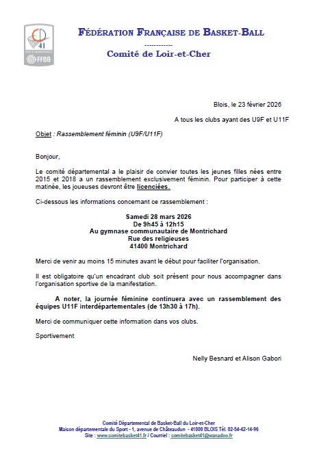 Journée Féminine 28 mars 2026 — Gymnase communautaire Montrichard U9F et U11F rassemblées pour une matinée basket ← Retour à tous les événements
